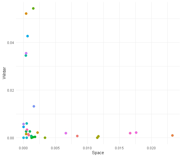 theme_minimal()Try to plot the results in 2D (space vs winter/space vs west/winter vs west). Feel like a challenge? Try using plotly to plot in 3D