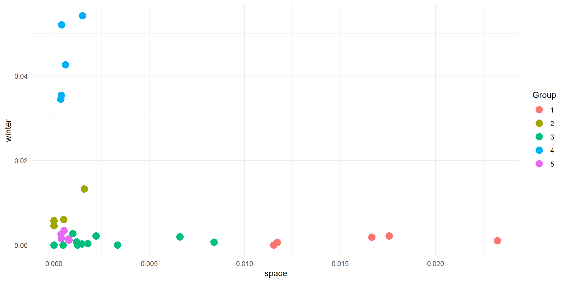 theme_minimal()We start by considering only 2 dimensions of our data (Space & Winter)